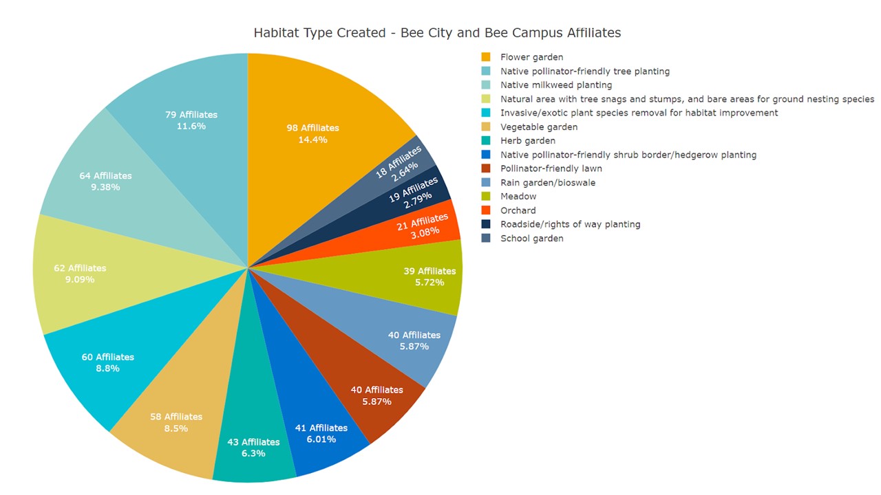 The amount of effort Bee City USA and Bee Campus USA affiliates dedicated to protecting pollinators in their communities in 2019 was incredibly impressive, and truly inspiring. Affiliates not only created and enhanced habitats, reduced pesticide use, and hosted education and awareness events, but they approached these activities with creativity, enthusiasm, and candor.
