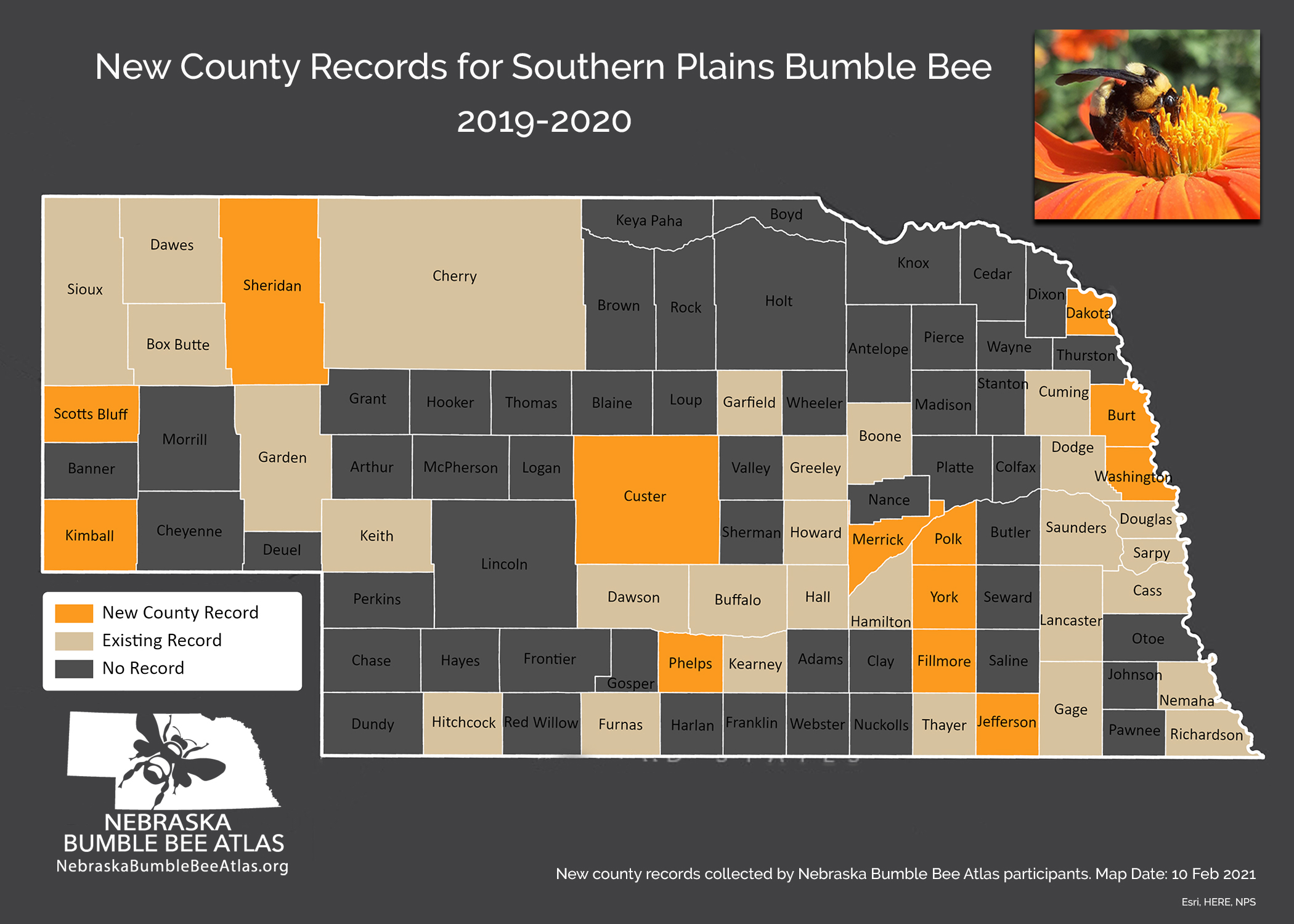 In the last two years, Nebraska Bumble Bee Atlas participants have added observations of the southern plains bumble bee (Bombus fraternus) in thirteen counties where it had not previously been recorded, significantly increasing our understanding of this imperiled species! The inset image of the southern plains bumble bee was submitted by community scientist Kellie Hayden. If you're in (or near) Nebraska, you can join the atlas project, but if you're anywhere in the U.S. or Canada, you can participate in Bumble Bee Watch.