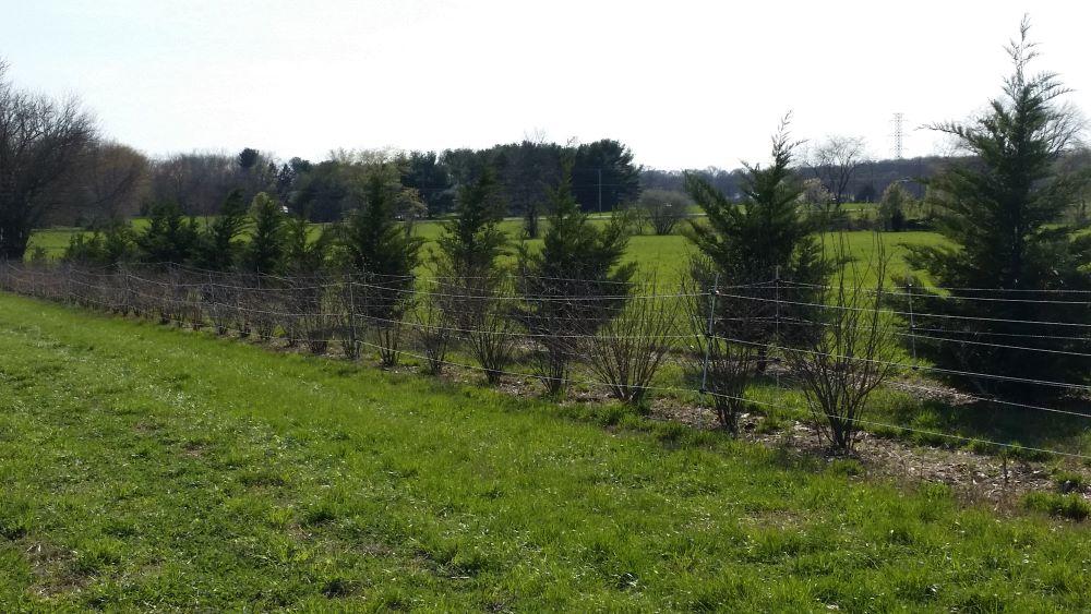 The evergreen windbreak on this organic farm helps to protect the newly installed pollinator hedgerow from pesticide drift from neighboring properties. (Photo: Kelly Gill, Xerces Society.)
