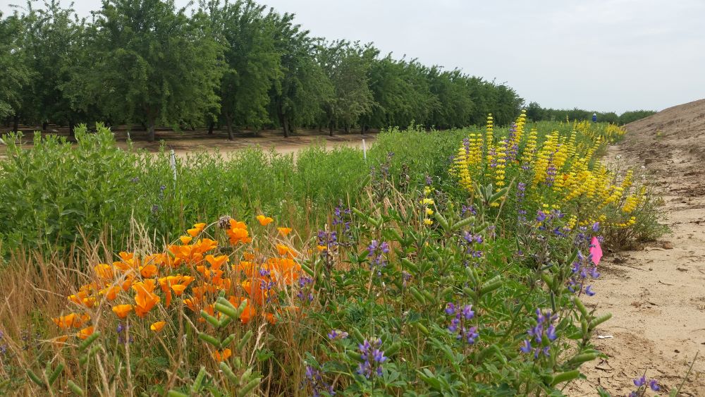 Recent research from UC Davis found that the abundant local flowering resources provided by field margin wildflower plantings helped to sustain bumble bee queen production even at sites with higher pesticide risk - Olam Orchards_CA_Pollinator Habitat. (Photo: Jessa Cruz/ Xerces Society.)