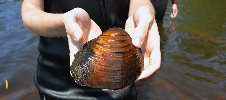 Freshwater mussels are long-lived and sensitive to environmental changes, making them excellent bioindicators. Incredibly, some species can live for up to 100 years and are relatively stationary. As we can look at tree rings to measure the age of a tree and learn about the climate and conditions of a forest over many years, mussel biologists can determine the age of freshwater mussels by counting the rings etched into shells and make observations about long-term stream health.