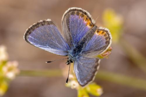 The El Segundo blue is in the family Lycaenidae (gossamer wings). A small butterfly, it is usually less than one inch across. The dorsal wing coloration is blue, with the males a brighter blue than the females. The ventral side is gray, with bold, square-shaped spots and a series of orange spots on the hindwing that appear merged into a single band of color.