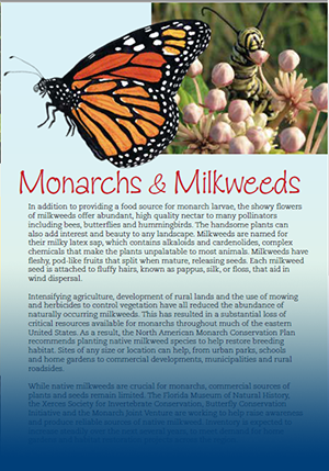 The Florida Museum of Natural History, in collaboration with the Xerces Society, the Butterfly Conservation Initiative, and the U.S. Forest Service, has produced three educational brochures that feature information about monarchs and milkweeds. One side of the brochure describes the plight of the monarch and encourages the planting of regionally appropriate milkweed species, while the second side showcases larvae of other butterfly species and their associated host plants.