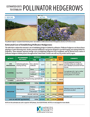 This fact sheet outlines the estimated costs of establishing hedgerow habitat for pollinators. Pollinator hedgerows are diverse linear plantings of native flowering trees, shrubs, perennial wildflowers and grasses designed to provide foraging and nesting habitat for pollinators. These estimates represent average costs of establishing hedgerows from transplants, and are derived from a series of pollinator hedgerow habitat projects throughout the United States. Actual costs vary from project to project and region to region.