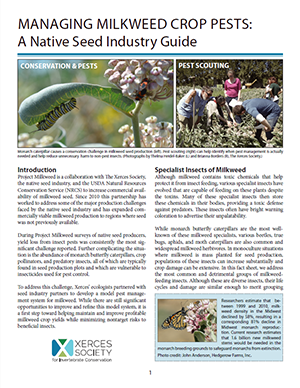 Increasing the availability of milkweeds is critical to monarch conservation, but seed production can be difficult. While monarchs are the most well-known milkweed specialists, other specialist milkweed-feeding insects can cause damage to valuable milkweed crops. Our guide provides management strategies for dealing with common milkweed pests including aphids, milkweed bugs, and milkweed beetles.