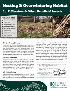 The availability of nesting and overwintering habitat is one of the most important factors influencing populations of native bees and other beneficial insects. Yet, traditional landscaping practices rarely leave enough natural resources to support pollinators and other wildlife. This guide focuses on a variety of natural nesting habitat features that can be readily incorporated into most landscapes. Compared to artificial nesting options such as bee blocks and bee hotels, natural nesting habitat features often better mimic the natural nest site density of insects, and also break down naturally with time, limiting disease and parasite issues. Moreover, natural nesting features often provide multiple conservation benefits. An appropriately managed wildflower planting, for example, can provide nesting sites, pollen, and nectar for bees; host plants and overwintering habitat for butterflies; and abundant food for songbirds.