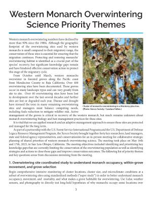 Western monarch overwintering numbers have declined by more than 90% since the 1980s. Although the geographic footprint of the overwintering sites used by western monarchs is small compared to their migratory range, the conservation of these sites is essential for ensuring that the migration continues, but significant knowledge gaps remain and have hindered effective conservation action to protect this stage of the migratory cycle.