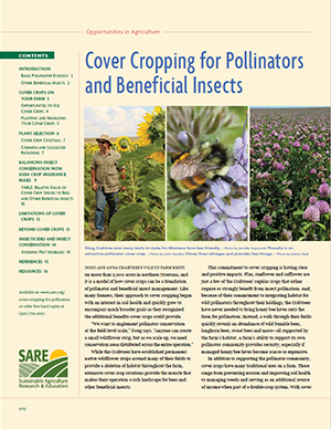 This 16-page bulletin will help you use cover crops to encourage populations of pollinators and beneficial insects on your farm while you address your other resource concerns. It begins with a broad overview of pollinator and beneficial insect ecology, then describes cover crop selection and management, how to make cover crops work on your farm, and helpful and proven crop rotations. It will also touch on the limitations of cover crops and pesticide harm reduction, among other topics.