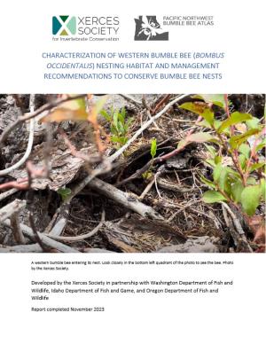 As populations of a variety of bumble bee species, including the western bumble bee (Bombus occidentalis), become increasingly rare, protecting and expanding high-quality habitat is essential. In addition to flowering plants on which to forage, bumble bees require nesting and overwintering habitat. While a substantial amount is known about what constitutes high quality foraging habitat, much less is known about where the western bumble bee overwinters and nests. This document characterizes western bumble bee nesting habitat and provides management recommendations to conserve bumble bee nests.