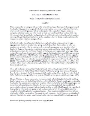 Releasing lady beetles for biological control may seem beneficial, however this practice harms native lady beetles at collection sites, may harm local populations at release sites, and has been shown to not be effective at helping control local pest species.