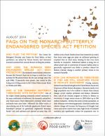 This 3-page fact sheet provides answers to commonly asked questions regarding the Petition to list the monarch butterfly as Threatened under the Endangered Species Act.