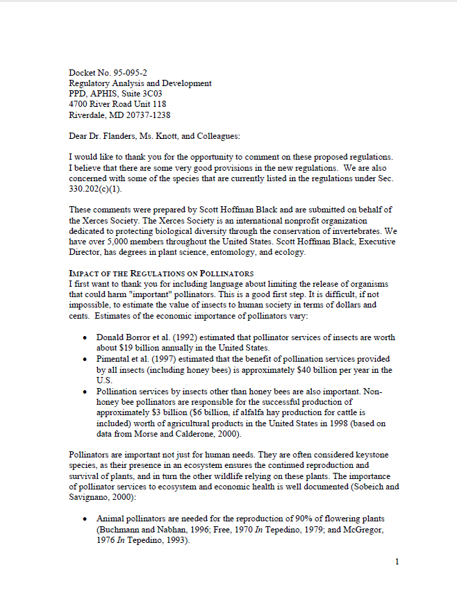 Written Testimony from the Xerces Society on Senate Bill 606 (March 28, 2001)